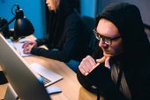 wysoki kąt widzenia Młodzi Hacker Rozwój złośliwego oprogramowania w ciemnym pokoju