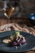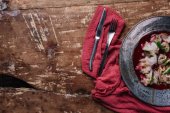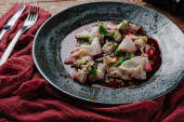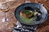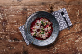 Widok z góry wykwintne danie z dorado i Rzodkiew japońska na drewnianym stole