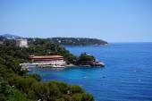 Villefranche-sur-Mer, Francja, na 6 marca 2018 r. Widok na malowniczą zatokę, nabrzeże i kolei przekazywania na seashore