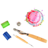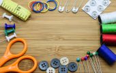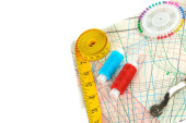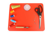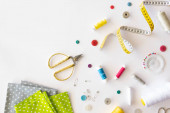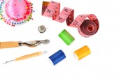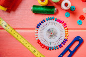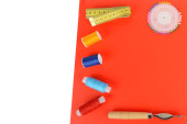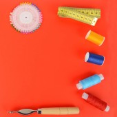 Kompozycja z wątków i akcesoria do szycia na czerwonym tle. Wzór do szycia. Widok płaski świeckich, top. Ilość wolnego miejsca dla tekstu.
