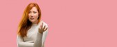 Piękne młode Rude kobiety oburzony i wściekły, utrzymując ręce w geście stop, w celu obrony, krzycząc: