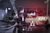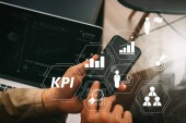Kluczowy wskaźnik wydajności (Kpi) workinng z metryki Business Intelligence (Bi) środek osiągnięcia i planowanych target.co pracy zespołu spotkanie koncepcja, biznesmen za pomocą smartfona i tabletu cyfrowy.
