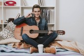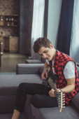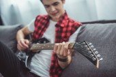 szczęśliwy nastolatek gra gitara elektryczna siedząc na kanapie w domu