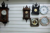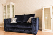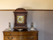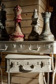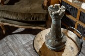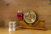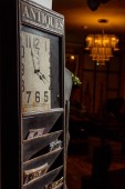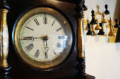 Stary zegar na drewnianym stole w nowoczesny salon w stylu retro