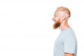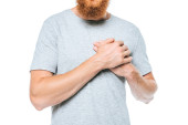 częściowy widok człowieka z wyciągniętymi rękami na białym tle