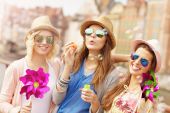 Szczęśliwa dziewczyna przyjaciółmi wylegiwanie się w mieście w okresie letnim