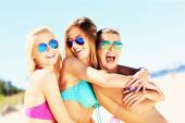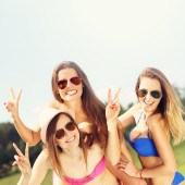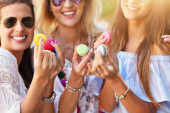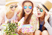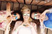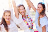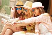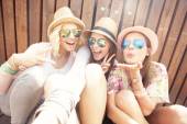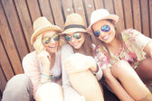 Szczęśliwa dziewczyna przyjaciółmi wylegiwanie się w mieście w okresie letnim