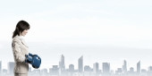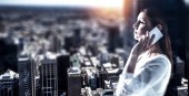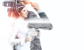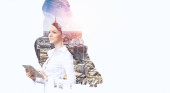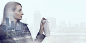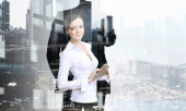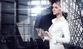 Atrakcyjny biznes dama działa na tablecie. Techniki mieszane