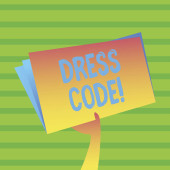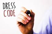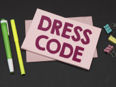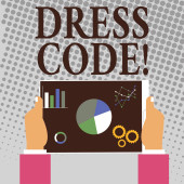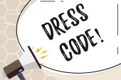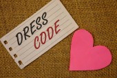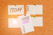 Uwaga: pisanie Wyświetlono Dress Code. Biznesowe zdjęcie prezentujący zasady co można nosić a nie do szkoły lub eventideas pomysł wiadomości utworzone na tle czarne litery czerwony notebook