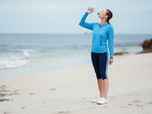 atrakcyjne sportsmenka, rozciągający się na plaży z butelka sportowa