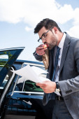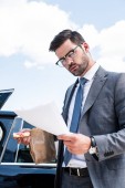 biznesmen w okulary z zabrać jedzenie, picie kawy, aby przejść stojąc w pobliżu samochodu na ulicy