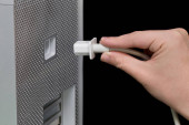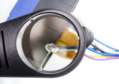 Starszy człowiek ręcznie cięcia kabla na jego pakiet telewizji kablowej