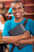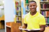 zadowolony mężczyzna kolegium afrykańskich studentów czytania książki w bibliotece