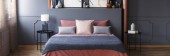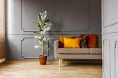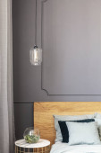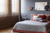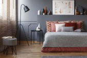 Zdjęcie "Szary fotel stojący w ciemno szara sypialnia wnętrza z formowania na ścianie, pomarańczowy obok tabeli z roślin i lampy oraz łóżko podwójne z poduszkami" może być wykorzystywane do celów osobistych i komercyjnych zgodnie z warunkami zakupionej licencji Royalty-free. Obraz jest dostępny do pobrania w jakości wysokiej rozdzielczości do 5760x3840.
