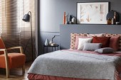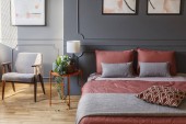 Szary fotel stojący w ciemno szara sypialnia wnętrza z formowania na ścianie, pomarańczowy obok tabeli z roślin i lampy oraz łóżko podwójne z poduszkami