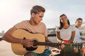 Młodzi i szczęśliwy uliczni grajkowie granie muzyki i śpiewanie w mieście
