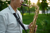 Zdjęcie "Przycięte widok człowieka african american grać na saksofonie, występując na ulicy słonecznej miasta" może być wykorzystywane do celów osobistych i komercyjnych zgodnie z warunkami zakupionej licencji Royalty-free. Obraz jest dostępny do pobrania w jakości wysokiej rozdzielczości do 5760x3840.