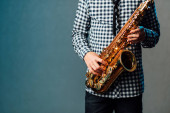Przycięte widok człowieka african american grać na saksofonie, występując na ulicy słonecznej miasta