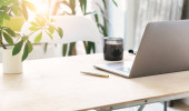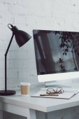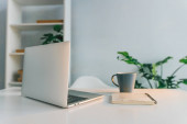 Selektywny fokus laptopa z pustego ekranu przy stole z książek i filiżankę kawy
