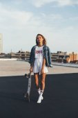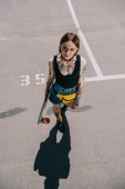 stylowa dziewczyna tatuażem z szerokie ramiona, patrząc na kamery