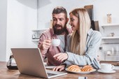 Portret małżonków razem przy użyciu laptopa w kasie w kuchni