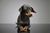 Portret czerwony Seter irlandzki dysząc na czarnym tle .studio strzał
