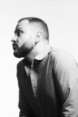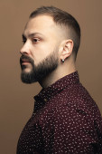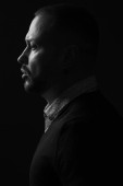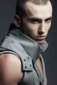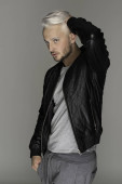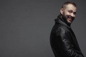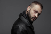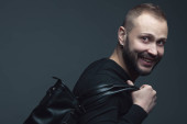 Koncepcja na zawsze czarny. Atrakcyjny przystojny mężczyzna w modnej odzieży casual torba skórzana na szarym tle. Z bliska. Strzał studio