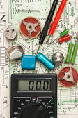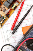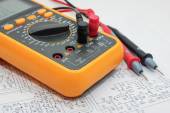Selektywny fokus przewidywalności orzeczeń drut kabel na tle schemat elektryczny.