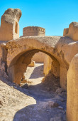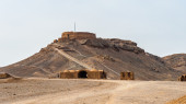 Obiekty sakralne zoroastryjskim w wykopaliska archeologiczne obok Yazd - pogrzeb Wieża milczenia na szczycie wzgórza i uroczyste Khaiele u podnóża wzgórza, Iran.