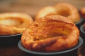 Świeżo ugotowane budynie Yorkshire na niedzielę pieczeń kolację. Dania kuchni brytyjskiej, angielski.