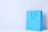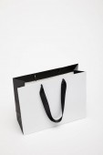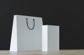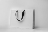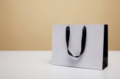 jeden biały torba na zakupy z czarny uchwyt na biały stół na beżowym tle