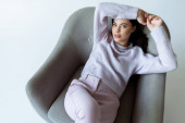 atrakcyjna kobieta modne pozowanie w biały sweter modne, beżowe spodnie i szpilki jesień, na szary