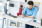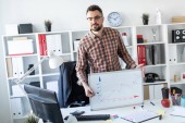 Człowiek w biurze jest stojący w pobliżu stołu i wyjaśnia harmonogram rysowane na tablica magnetyczna.
