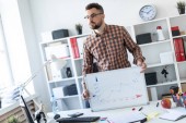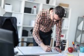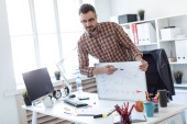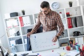 Człowiek w biurze jest stojący w pobliżu stołu i wyjaśnia harmonogram rysowane na tablica magnetyczna.