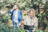 Widok z tyłu piękne młode pary w dżinsowe koszule z rowerem spaceru przez park