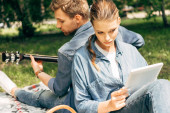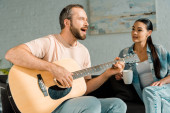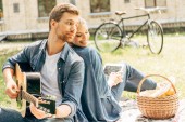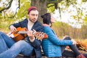 przystojny młody mężczyzna gra na gitarze dla jego dziewczyna podczas relaksu w parku