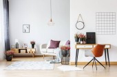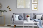 Białej kanapie z niebieski i szary poduszki i koc obok rośliny w Wnętrze salonu