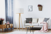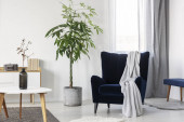 Zdjęcie "Białej kanapie z niebieski i szary poduszki i koc obok rośliny w Wnętrze salonu" może być wykorzystywane do celów osobistych i komercyjnych zgodnie z warunkami zakupionej licencji Royalty-free. Obraz jest dostępny do pobrania w jakości wysokiej rozdzielczości do 5760x3840.