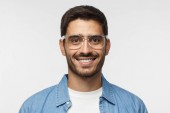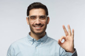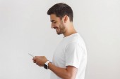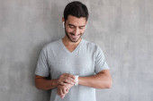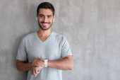 Portret przystojny mężczyzna w t shirt, stojący przed szary teksturowanej ściany z kopia miejsce na reklamy, Wyświetlono jego stylowy nowoczesny inteligentny zegarek z pustego ekranu