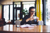 Zdjęcie "Pozytywne cute kobiet student siedząc przy kampusie uniwersyteckim i odwracając się z uśmiechem na twarzy podczas oczekiwania przyjaźń, sukces zamożnych młoda kobieta spędzania wolnego czasu na wypoczynek w coffee shop" może być wykorzystywane do celów osobistych i komercyjnych zgodnie z warunkami zakupionej licencji Royalty-free. Obraz jest dostępny do pobrania w jakości wysokiej rozdzielczości do 5760x3840.