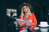 Pozytywne cute kobiet student siedząc przy kampusie uniwersyteckim i odwracając się z uśmiechem na twarzy podczas oczekiwania przyjaźń, sukces zamożnych młoda kobieta spędzania wolnego czasu na wypoczynek w coffee shop