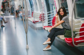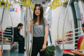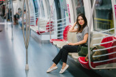 młody i ładny japoński turystycznych Azji kobieta siedzi w pociągu w Azji na wakacjach. Ona jest Ładna, atrakcyjna i szczęśliwie się uśmiecha jak ona relaksuje w jej miejsce.