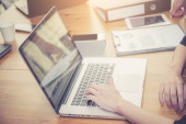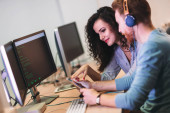 Zdjęcie "Zamyślony utalentowanych młodych web designer z kok włosy, wpisując na klawiaturze i patrząc na ekran laptopa podczas pracy z kolega w biurze" może być wykorzystywane do celów osobistych i komercyjnych zgodnie z warunkami zakupionej licencji Royalty-free. Obraz jest dostępny do pobrania w jakości wysokiej rozdzielczości do 5760x3840.