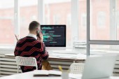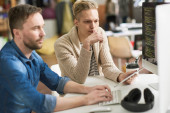 Zamyślony utalentowanych młodych web designer z kok włosy, wpisując na klawiaturze i patrząc na ekran laptopa podczas pracy z kolega w biurze