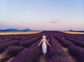 Powrót widzenia młoda kobieta, patrząc na malownicze Lawendowe pole w provence, Francja