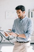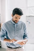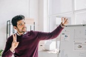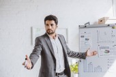uśmiechający się przystojny biznesmen prezentacji projektu na flipchart i patrząc na kamery w biurze