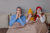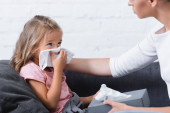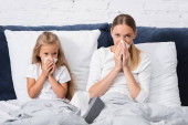 zbliżenie chorych młodych rodzin dmuchanie nosa z serwetki razem podczas leżenia w łóżku