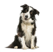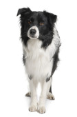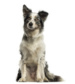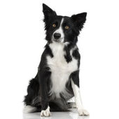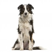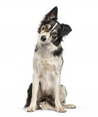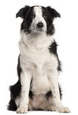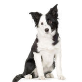 border collie, 8 miesięcy, siedząc i patrząc w kamerę przed białym tle