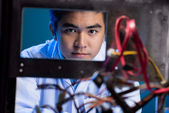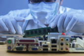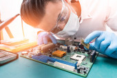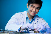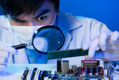 Inżynier przy użyciu pęsety do montażu obwodów drukowanych