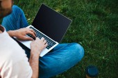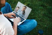 częściowy widok człowieka w słuchawki za pomocą laptopa z logo youtube na ekranie w biurze